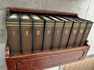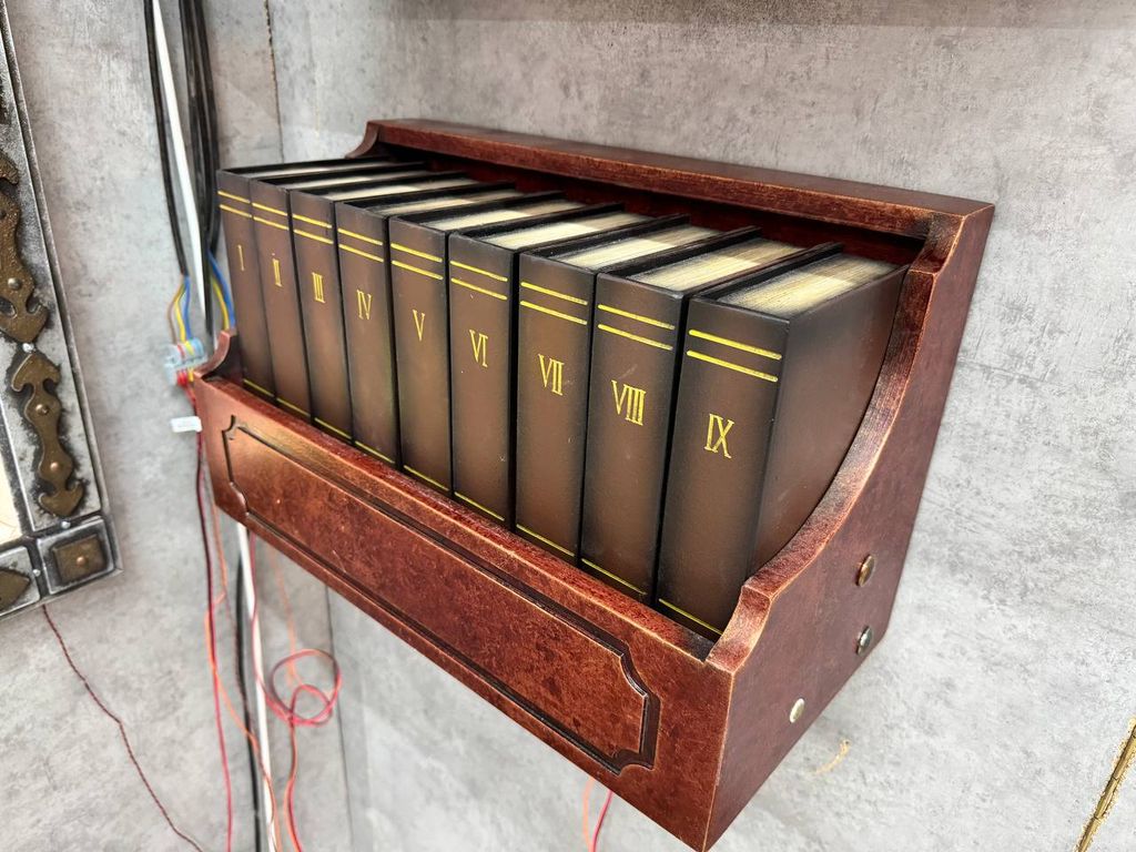 There are 9 books with Roman numerals on a wooden shelf. Each book can be tilted away from itself, and the task of the players is to simultaneously move several books forward. A hint will help them with this.