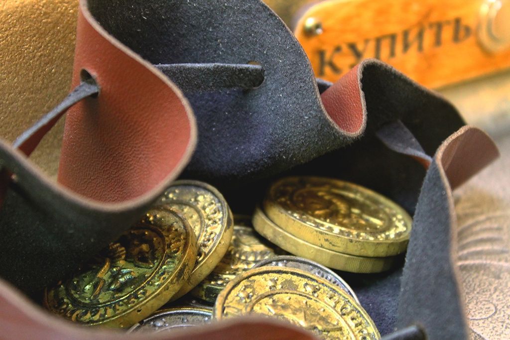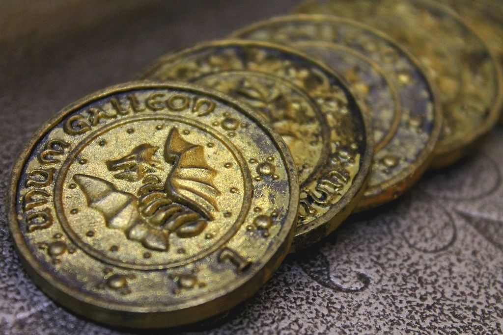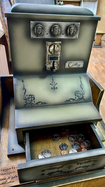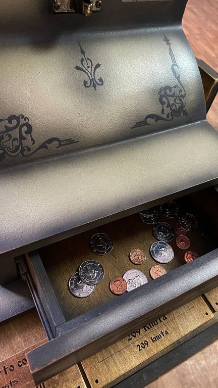 Players count the coins collected during the quest and insert them into a coin receiver with an indicator. The cash register has 3 gas lamps that show the numbers, a hole for receiving coins and a drawer. If the wrong amount is entered, the box will open, the players will collect the coins and try to insert the coins back into the receiver to buy the disc.