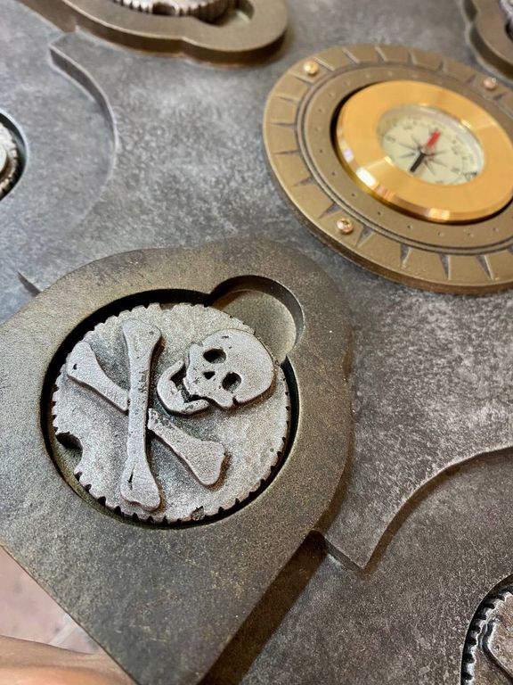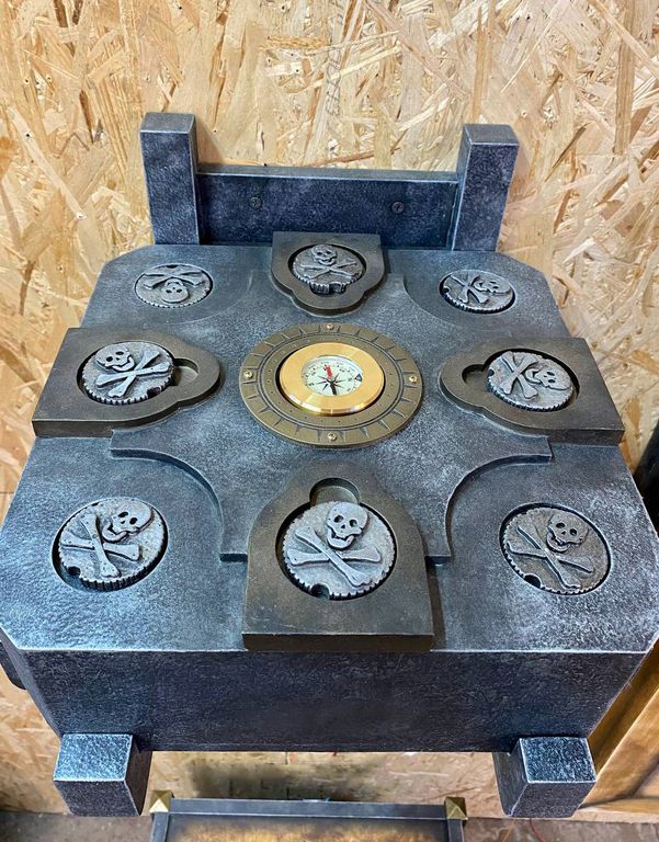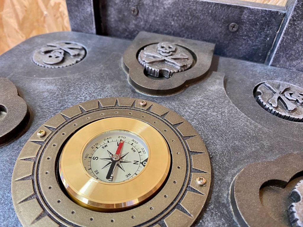 It is important to install the compass first and then look at where the red arrow of the compass will point, or rather, which cavity the arrow will be pointing at. As soon as the coin is placed in this cavity, the compass needle will change its vector, pointing to the next cavity for the second coin, and so on. Follow the red arrow of the compass, gradually putting the coins in their places, and after all the coins are placed, a wooden box with a magnetic lock with the image of a pirate will open.