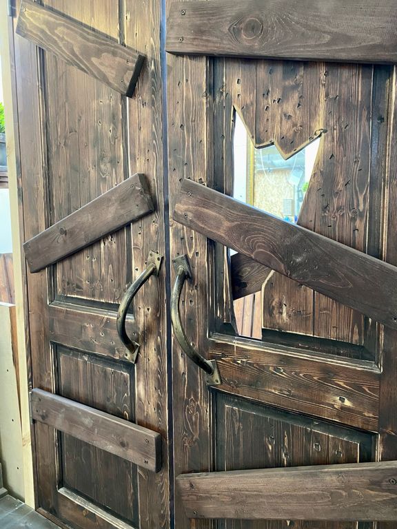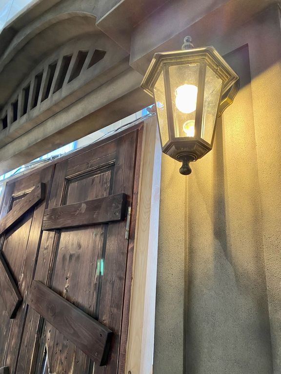 There are 2 columns on the sides, each with a lantern. There is a triangular roof on top, 2 rows of steps on the bottom. The door is locked with a metal latch and boarded up. There are 2 handles above the latch. The players need to guess how to put their hand through the opening in the place where the board is torn out and open the door from the inside.