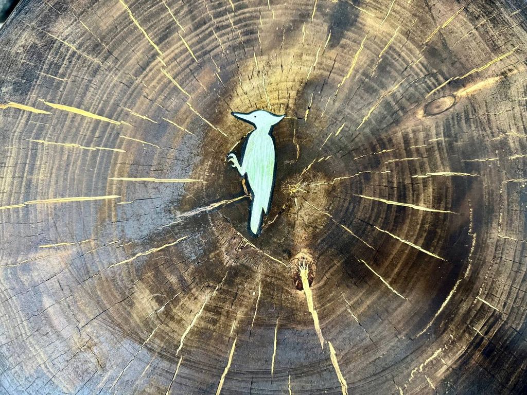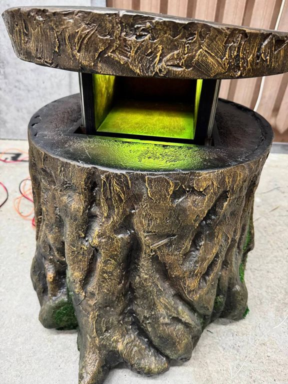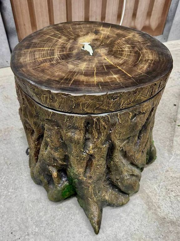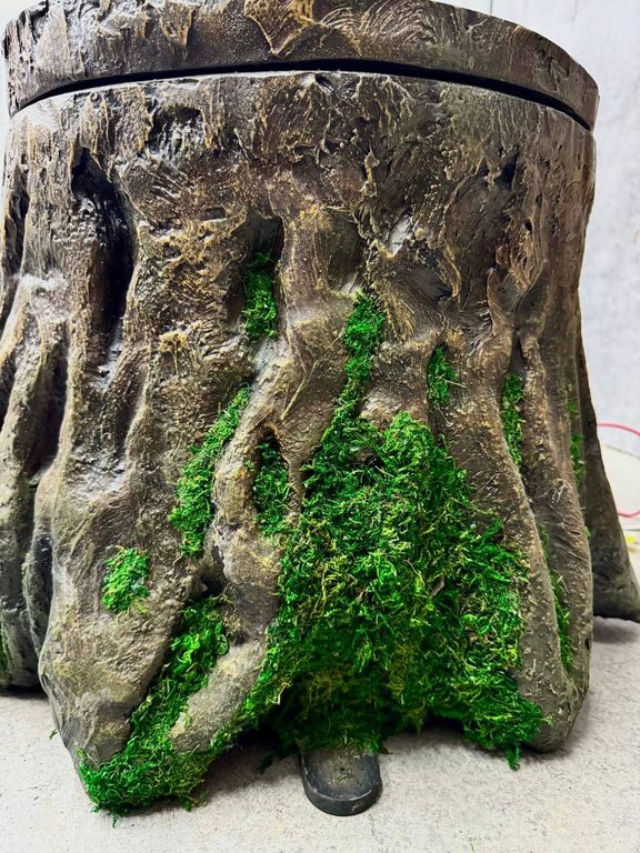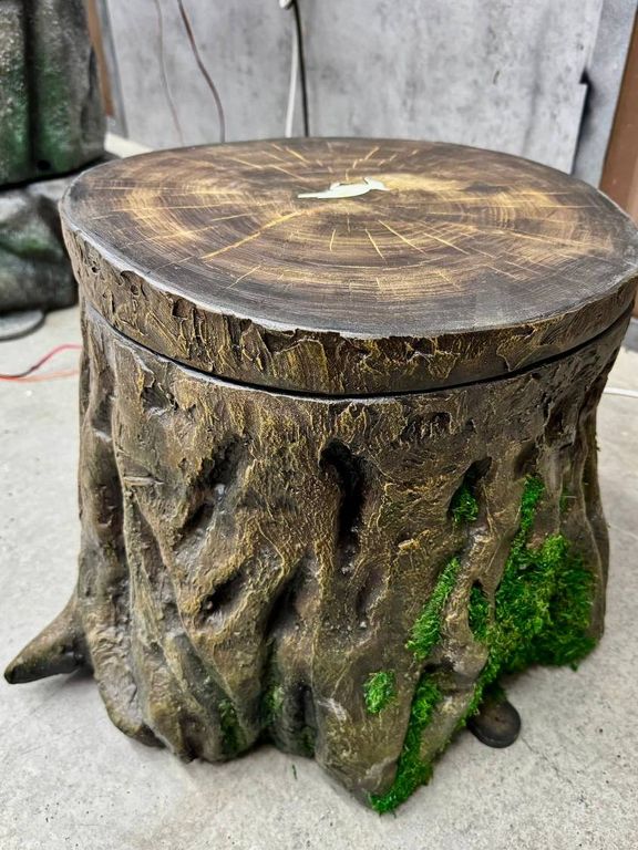 The symbol of a bird is depicted on the stump, and the side of the stump is decorated with artificial moss.