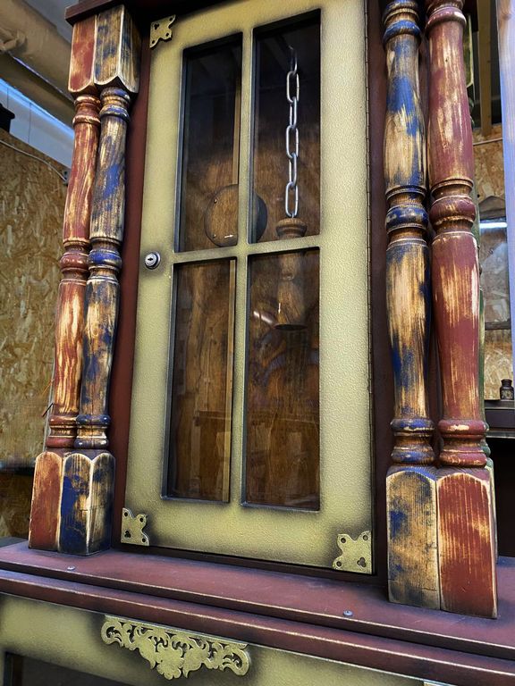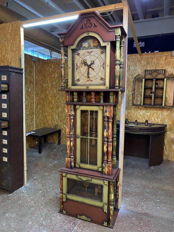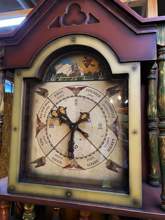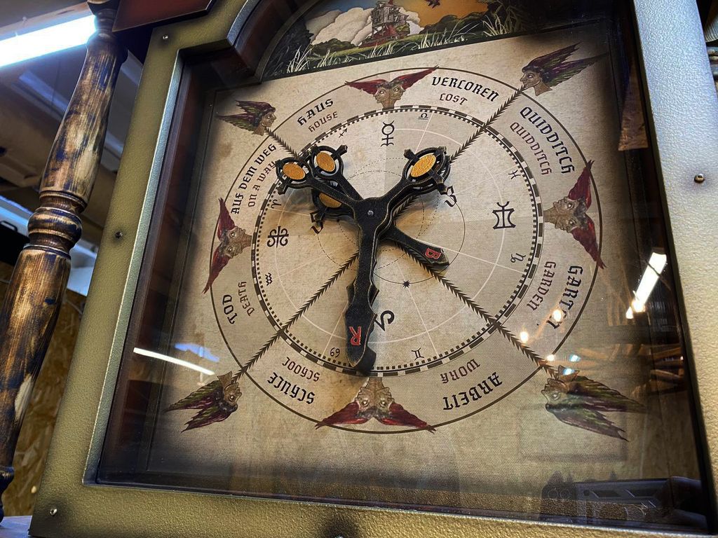 The clock face does not show the time, but where a particular family member, depicted as an arrow, could potentially be. The canvas of the dial is divided into 8 places: work, garden, home, death, Quidditch, on the way home, the coast, school. The task of the participants is to indicate where Ron, Arthur and Billius are now, as the other arrows will be fixed. The hands with the above characters can be moved in three ways: pull down the metal chain inside the watch, or turn the pendulum inside the watch left-right, or rotate the lower long baluster in any direction.